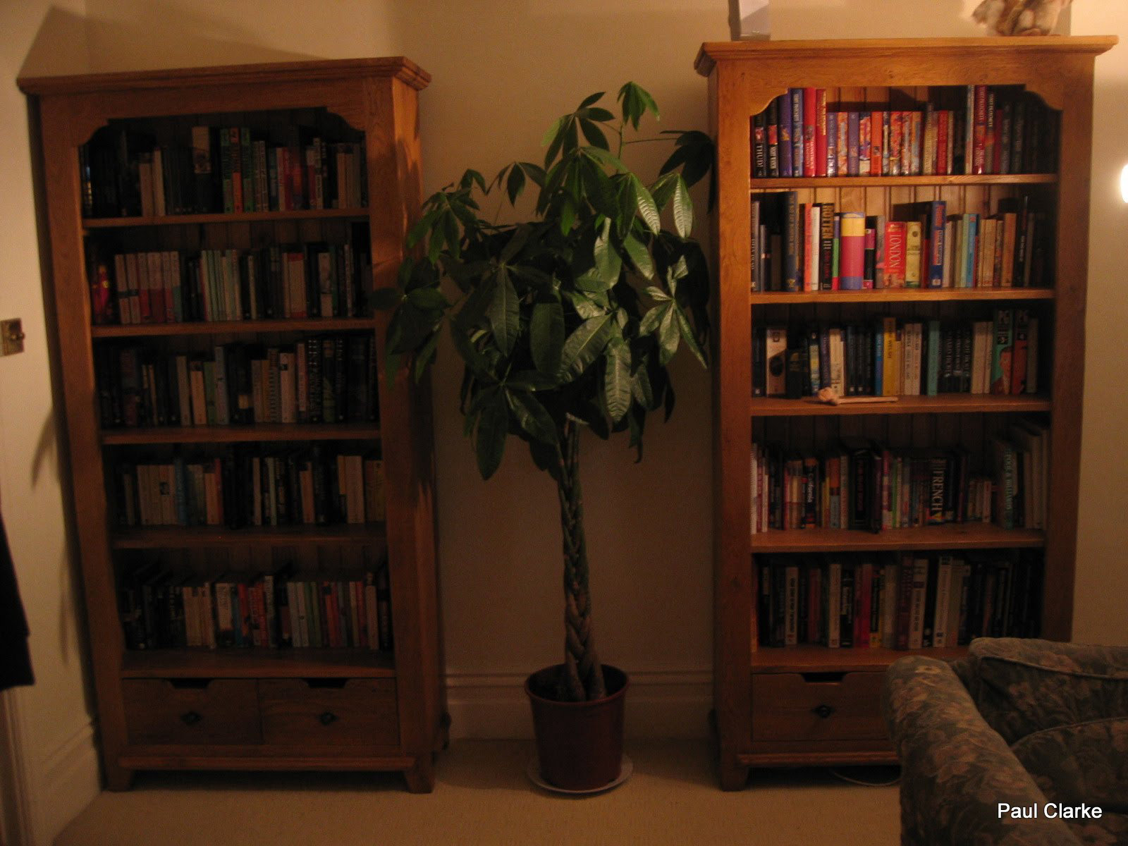 I thought this looked quite clear on the camera itself, and I've obviously just got used to feeling my way around the flat. It's pretty dark isn't it? That's the new bookcases I've been going on about for months, they're in the flat, in position, and fully laden with books. Actually we've not got room for all our books, we want to get another couple of those I think.