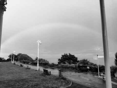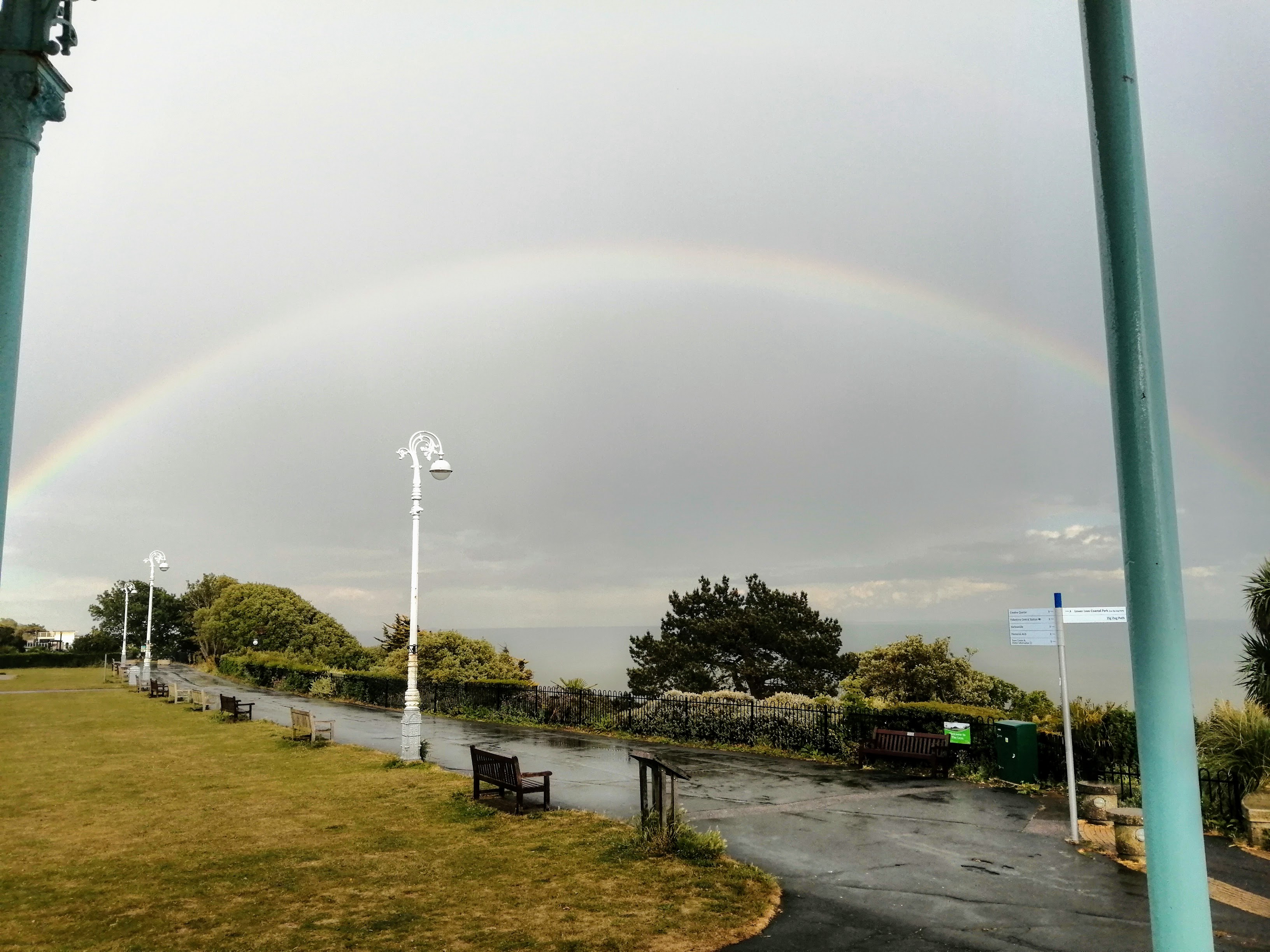 A high of only 13° and very windy today too, so I don't even fancy going for a walk or a run. I did 27,000 steps yesterday and will have done almost zero today. Maybe I will walk to the Inn Doors for a couple of pints of their takeout... Yesterday as well as my trip to Morrisons I walked back to Folkestone in the evening to meet some friends from work. A sort of leaving do for one, just to say goodbye. However it turned out he's not even officially leaving, just leaving the UK to go back to Portugal. In theory he's still working for the same company, from there. But as he's furloughed like me there's not much actual work going on. I was the only one who took a beer along to this leaving do, my takeout from the Inn Doors. As it was in my big insulated cup everyone thought it was a giant cup of tea. It's fine having a boozy drink that is sort of disguised like this isn't it? We chatted for over an hour in the end, though had to move actually into the bandstand to shelter from the rain for a bit. There was an excellent double rainbow, though you can only see the one in the picture below. Also the view changed hugely at various points while we were there, You could initially see France more clearly than I've ever noticed it before, then the rain came obscuring things.