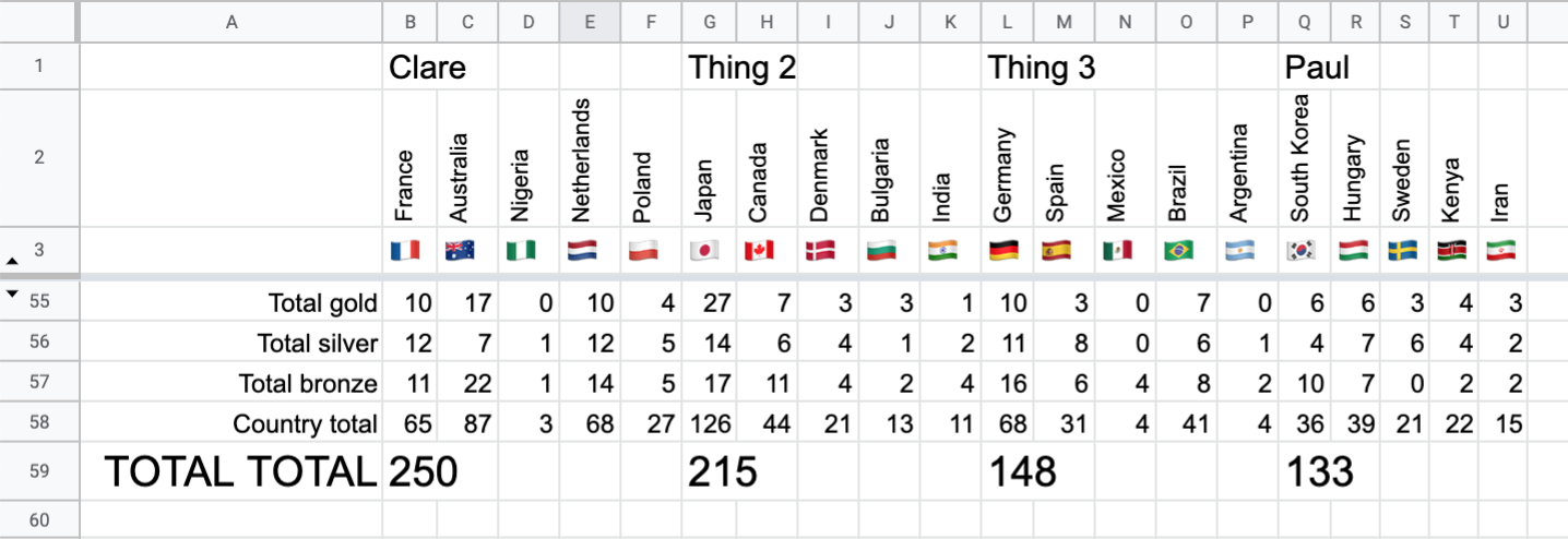 All over for another four years then. Except it is only three years until the next Olympics. Wife won the sweepstake, she picked the most carefully, I picked a bit randomly really. I came last, thing one was third, thing two in second and Clare first. Thing two had the host nation Japan who were the best performing of all the teams we were allowed to choose from, but Clare's combo of teams came out top.