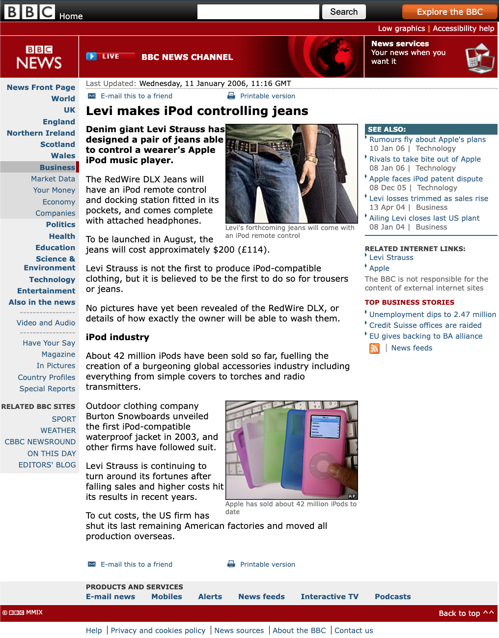 I did a little search for the ipod jeans I mentioned yesterday, that I first mentioned here twenty years ago. And I can save the results here for posterity! BBC reported on them and BBC are pretty good at keeping their old pages online. They said