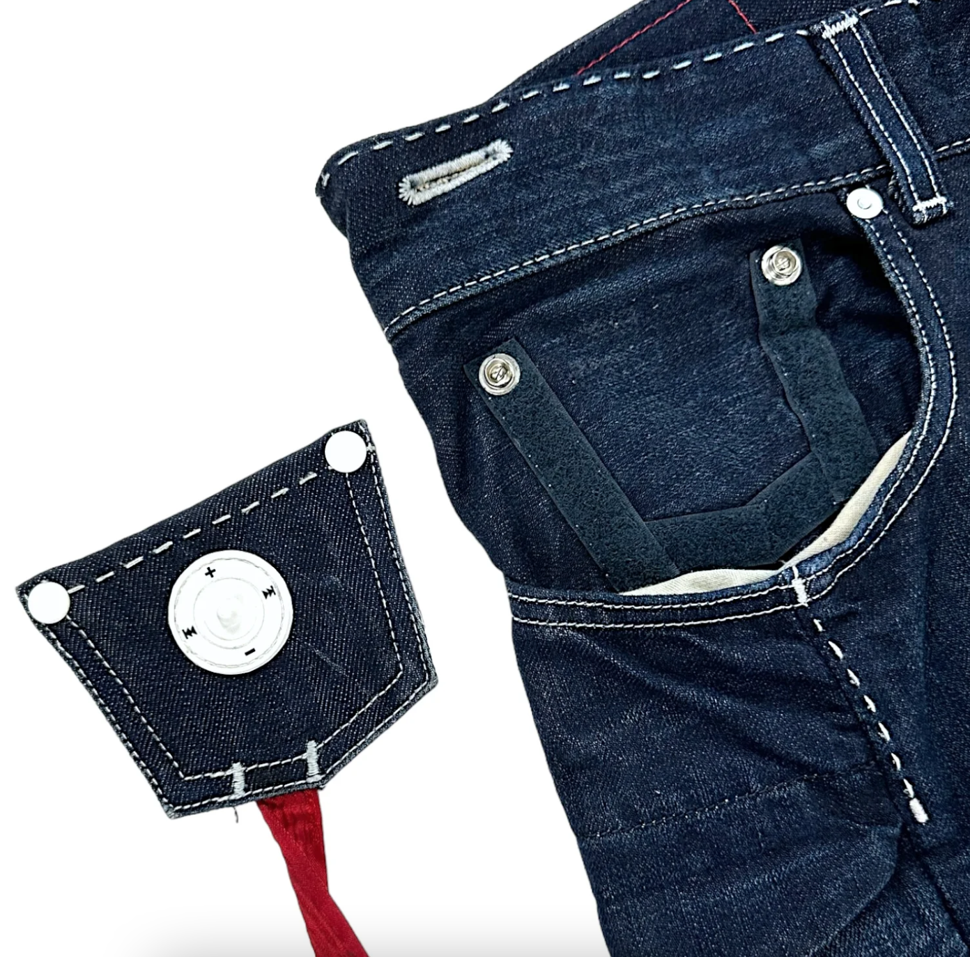 The RedWire DLX Jeans will have an iPod remote control and docking station fitted in its pockets, and comes complete with attached headphones.