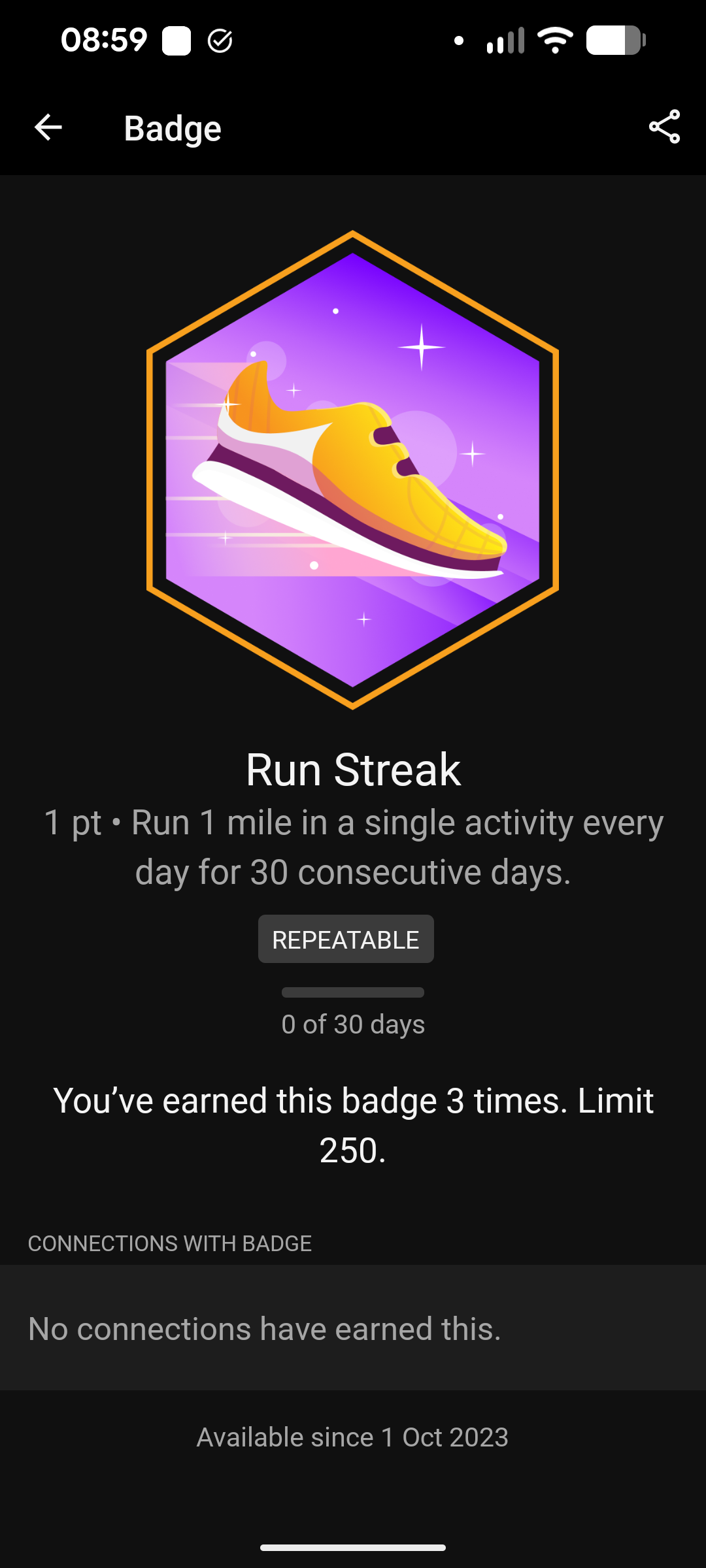 That's thirty days in a row of running 5k then. Garmin counts it as an achievement if you run more than a mile each day, so maybe I should dilute Runuary 1 slightly next year. Still get this badge.