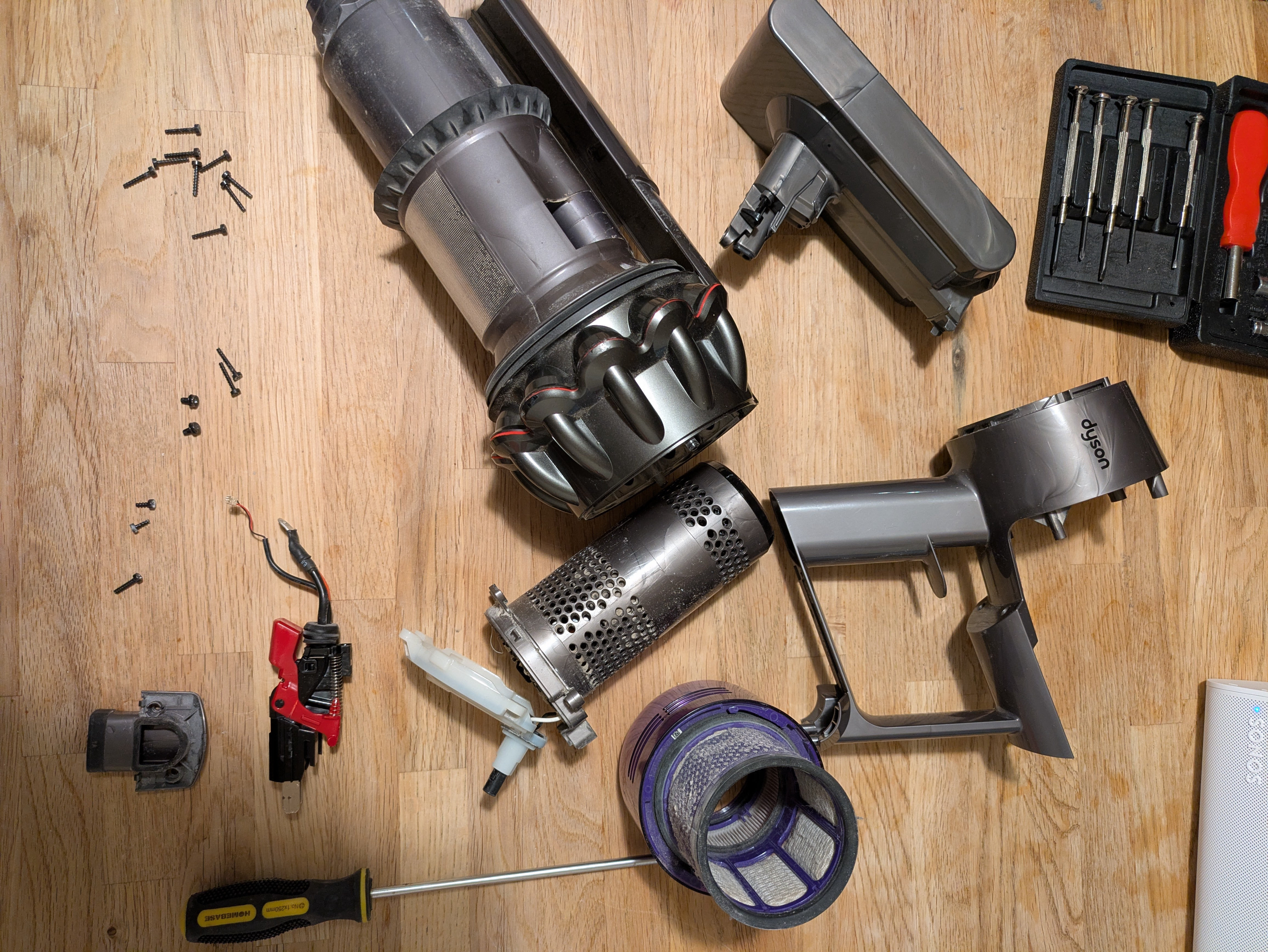 I've got the Dyson in bits, and a new part on the way, a replacement trigger but metal this time. I hope I can put it back together again...