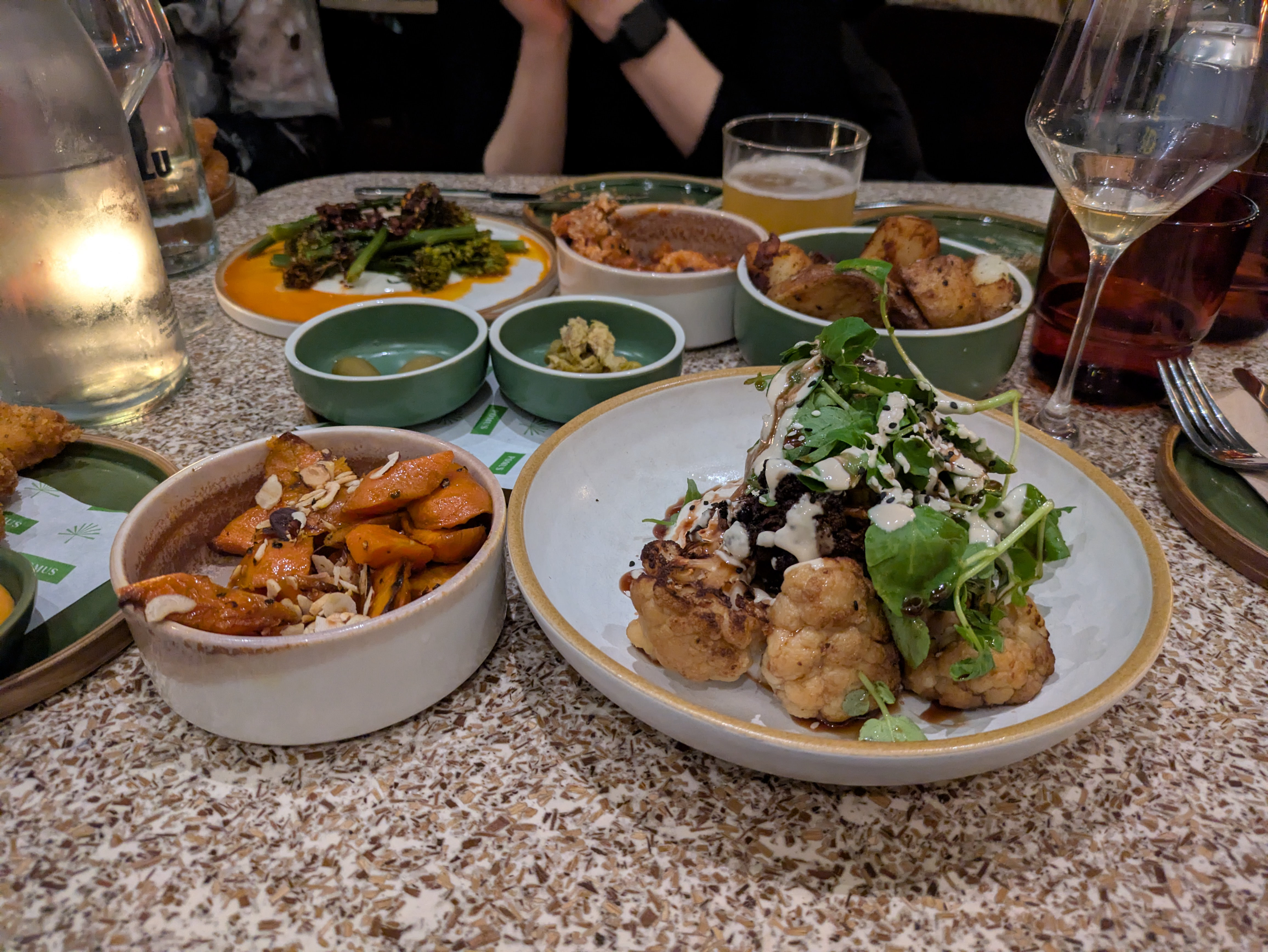 Went out for a great dinner with friends yesterday at Pomus in Folkestone. The food is mostly tapas style so we picked lots of different dishes. Only some of them I could eat so I ordered a "big plate" just for me too of roasted cauliflower with tahini, but there were also truffle potatos, carrots with almonds, tenderstem brocolli, and then things like chicken, trout, and scallops, not so much for me. Very nice food though and a nice place.