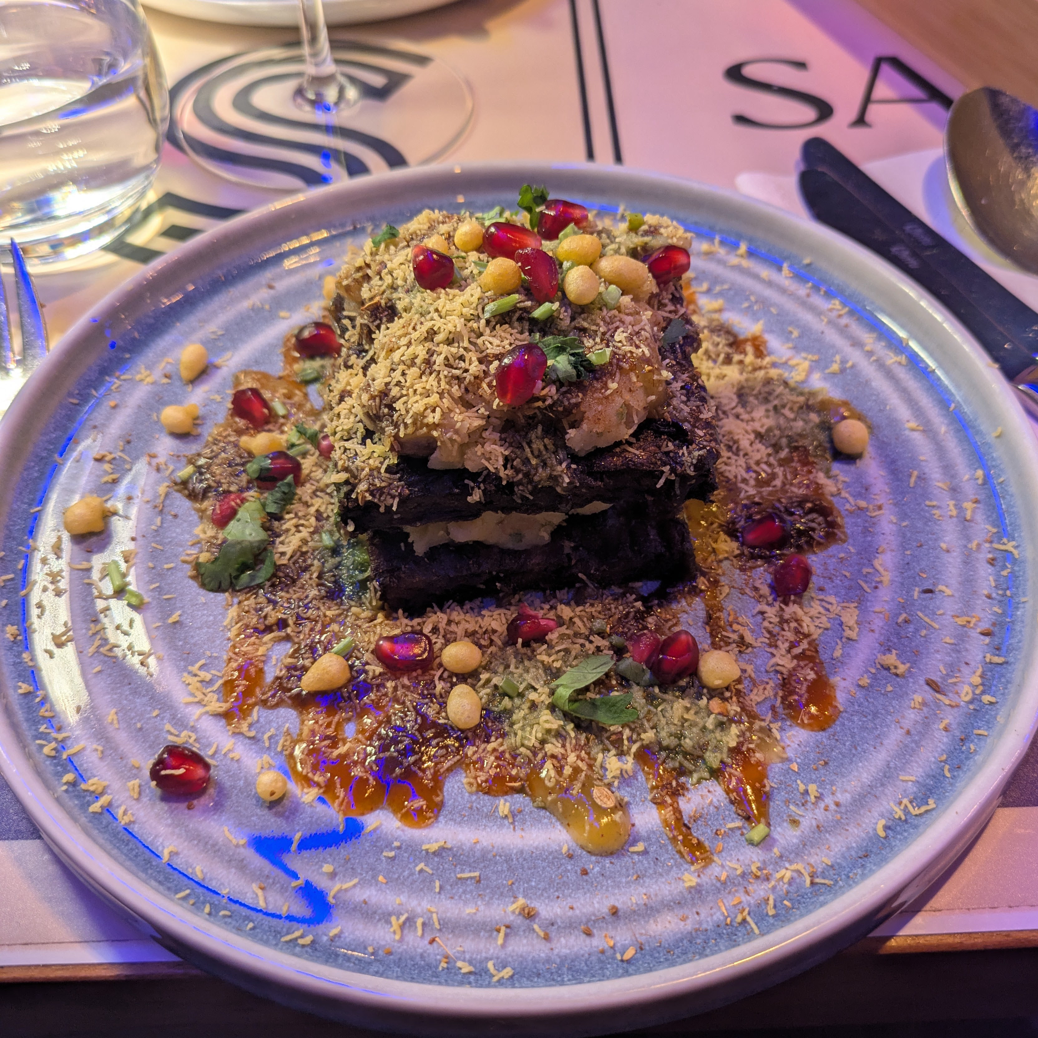Went out in Cheriton last night to a restaurant that everyone has been recommending, Saurav Ki Rasoi. It's a small Indian place, perhaps more like a cafe in the day, but definitely restaurant at night. I had Mille Feuille Onion Bhajia for starter, it looked more like a dessert and was fabulous.