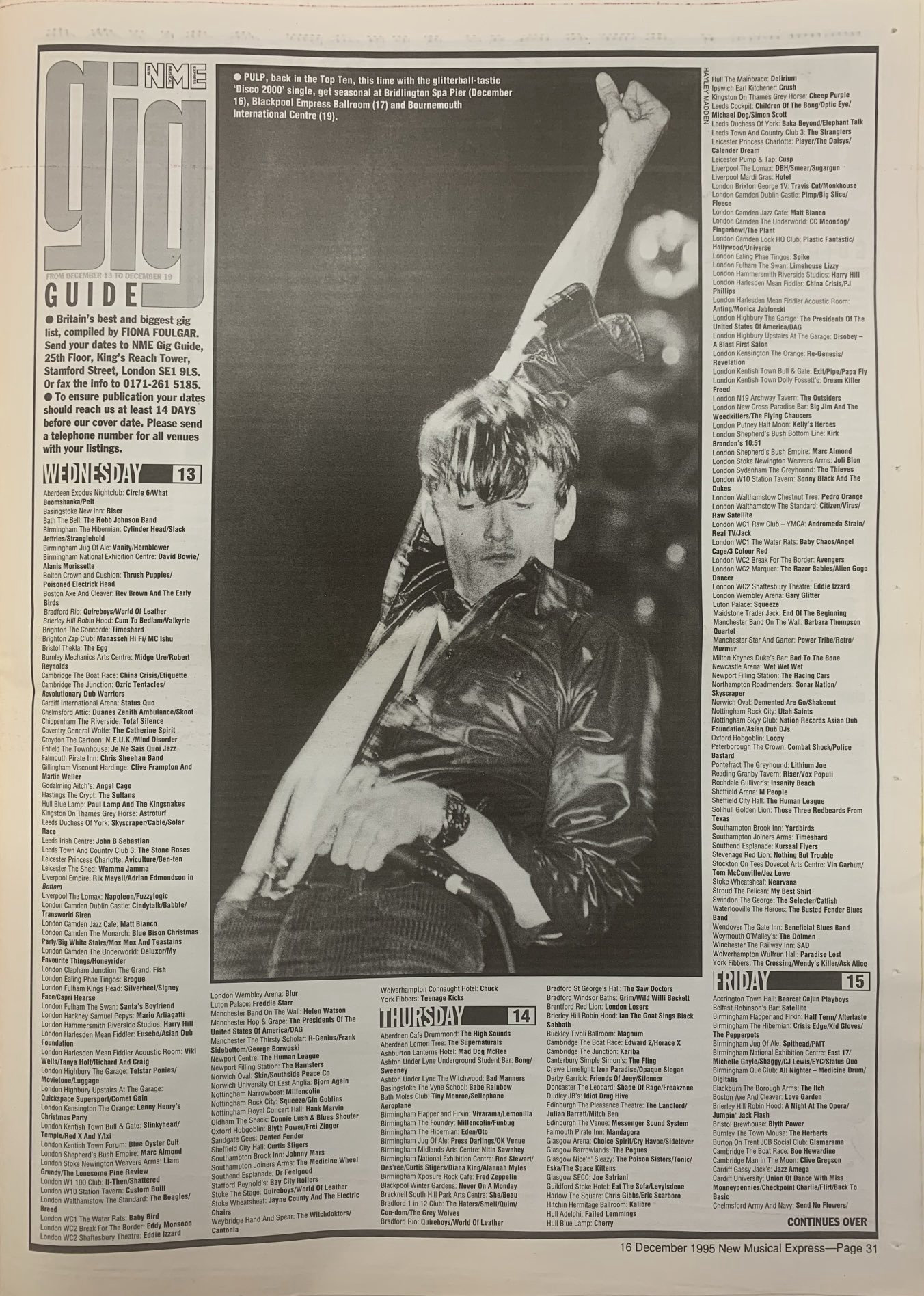 Gigs at Southampton Joiners I have been to are David Devant + his Spirit Wife (1996), Heavy Stereo ('96), Tiger ('96), Cecil (1996), Mansun ('96), The Divine Comedy ('96), Tripping Daisy ('96), Christian Death (1996), Number One Cup ('96), Northern Uproar (1996), Catatonia (1996), Perfume ('96), Smaller ('95), Longpigs (1995), Fluffy (1995), Gouge ('95), Thurman ('95), Perfume ('95), Mansun (1995), Skunk Anansie ('95), We Know Where You Live ('95), Salad (1995), Sultans of Ping (1995), Sleeper ('95), Supergrass (1995), Shed Seven ('94), Wishplants (1994), + The Primitives ('91).